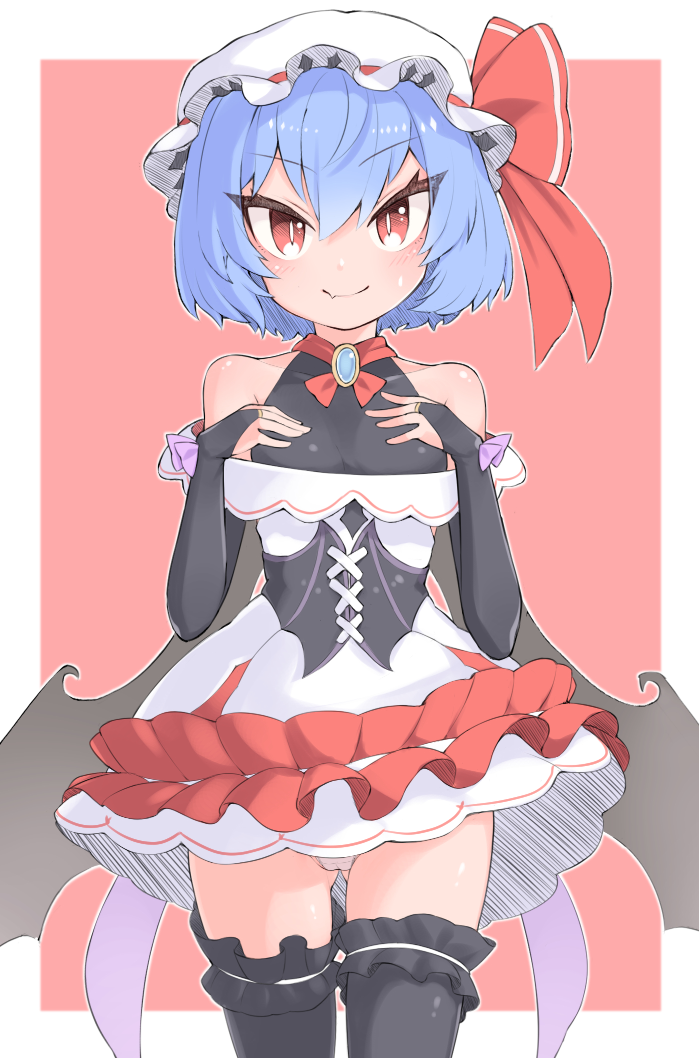 1girlalternate costumeascotbare shouldersbat wingsblack corsetblack glovesblack thighhighsblue hairbroochcameltoeclosed mouthcorsetcowboy shotdresselbow glovesfrilled thighhighsfrillsgloveshands uphathat ribbonjewelrymob cappantiespink backgroundred ascotred eyesred ribbonribbonshort hairsimple backgroundsleevelesssmilesolosweatdropthighhighstwo-tone backgroundunderwearwhite backgroundwhite pantieswings