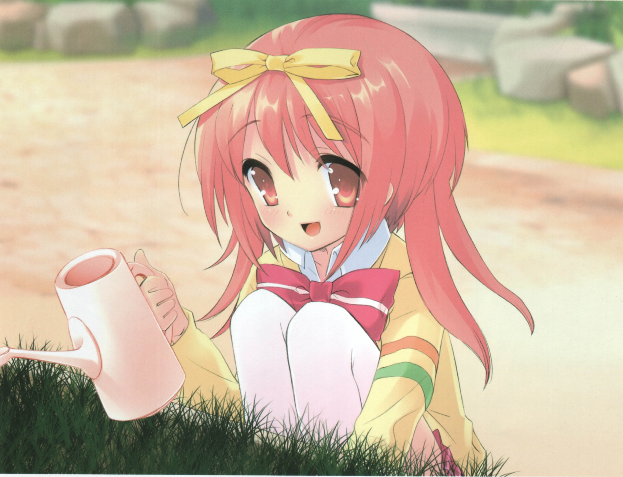 00s1girlblushdayfemale focusgrasshair ribbonhappyorange eyesoutdoorspink eyespink hairribbonschool uniformskirtsolosquattingthighhighswatering canwhite thighhighs