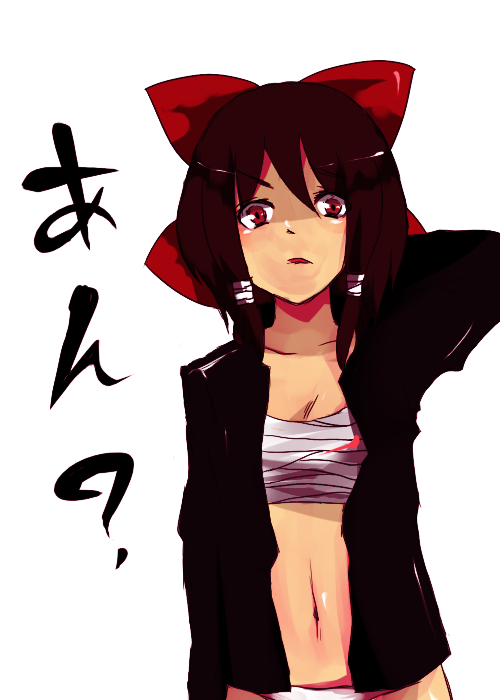 1girlbowfemale focushair bowjapanese clothesmikonavelopen clothesopen shirtpantiesred eyessarashishirtsolounderwearwhite background