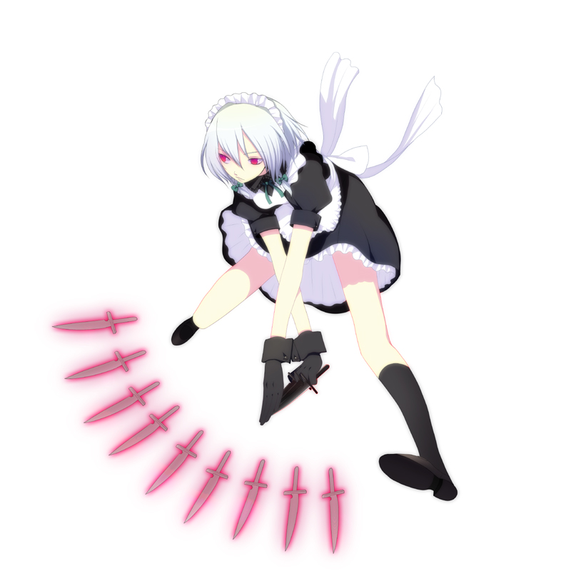 1girlapronblack dressblack socksdressfemale focusfloatingfloating objectfull bodykneehighsmagicpuffy short sleevespuffy sleevesred eyesshort sleevessimple backgroundsockssolowaist apronwhite background