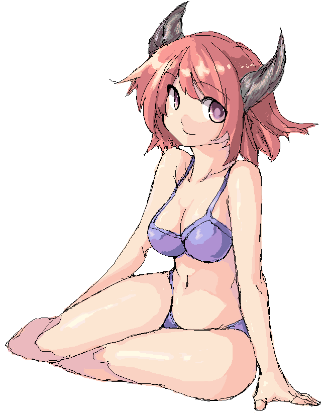 1girlarm supportbarefootbikinifemale focushornsoekakipurple bikinipurple eyesred hairshort hairsittingsmilesoloswimsuityokozuwari