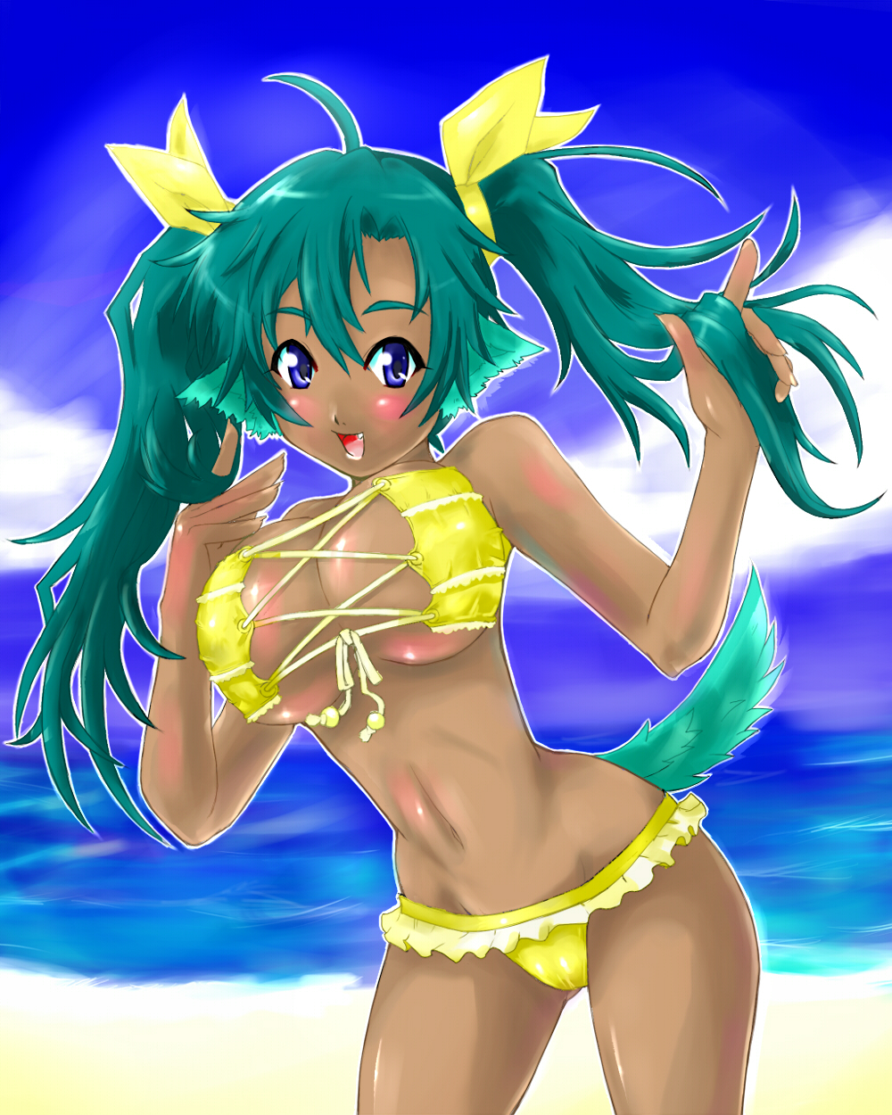 1girlanimal earsbeachbikiniblue eyesdark skindark-skinned femaledaydog earsfangfemale focusgreen hairlong hairoutdoorssoloswimsuittwintailsyellow bikini