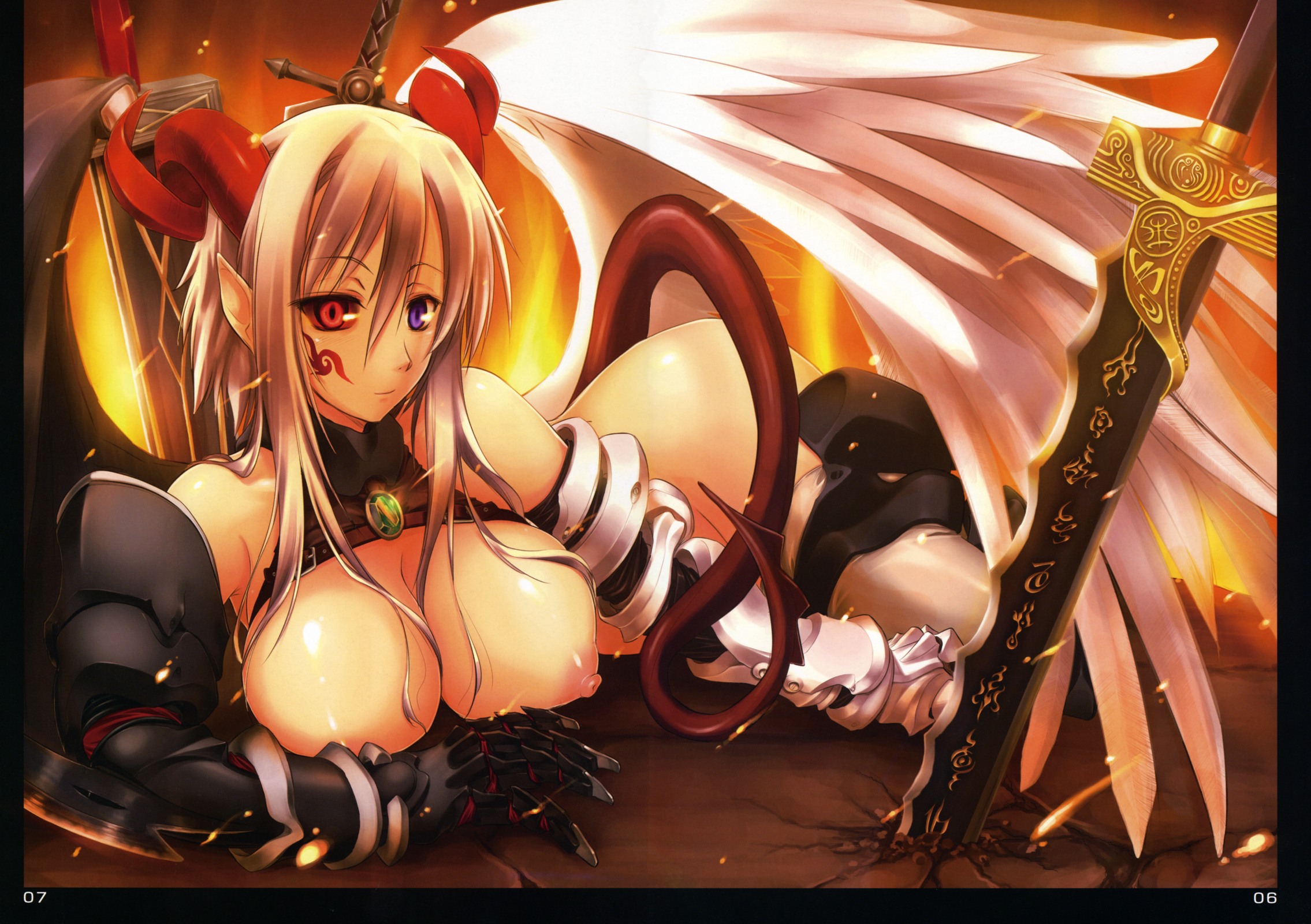 1girlangel wingsarmorasymmetrical wingsbat wingsblonde hairbreastsclawselbow glovesfemale focusfireglovesheterochromiahornshuge breastsnipplespurple eyesred eyesshort hairsoloswordtailweaponwings
