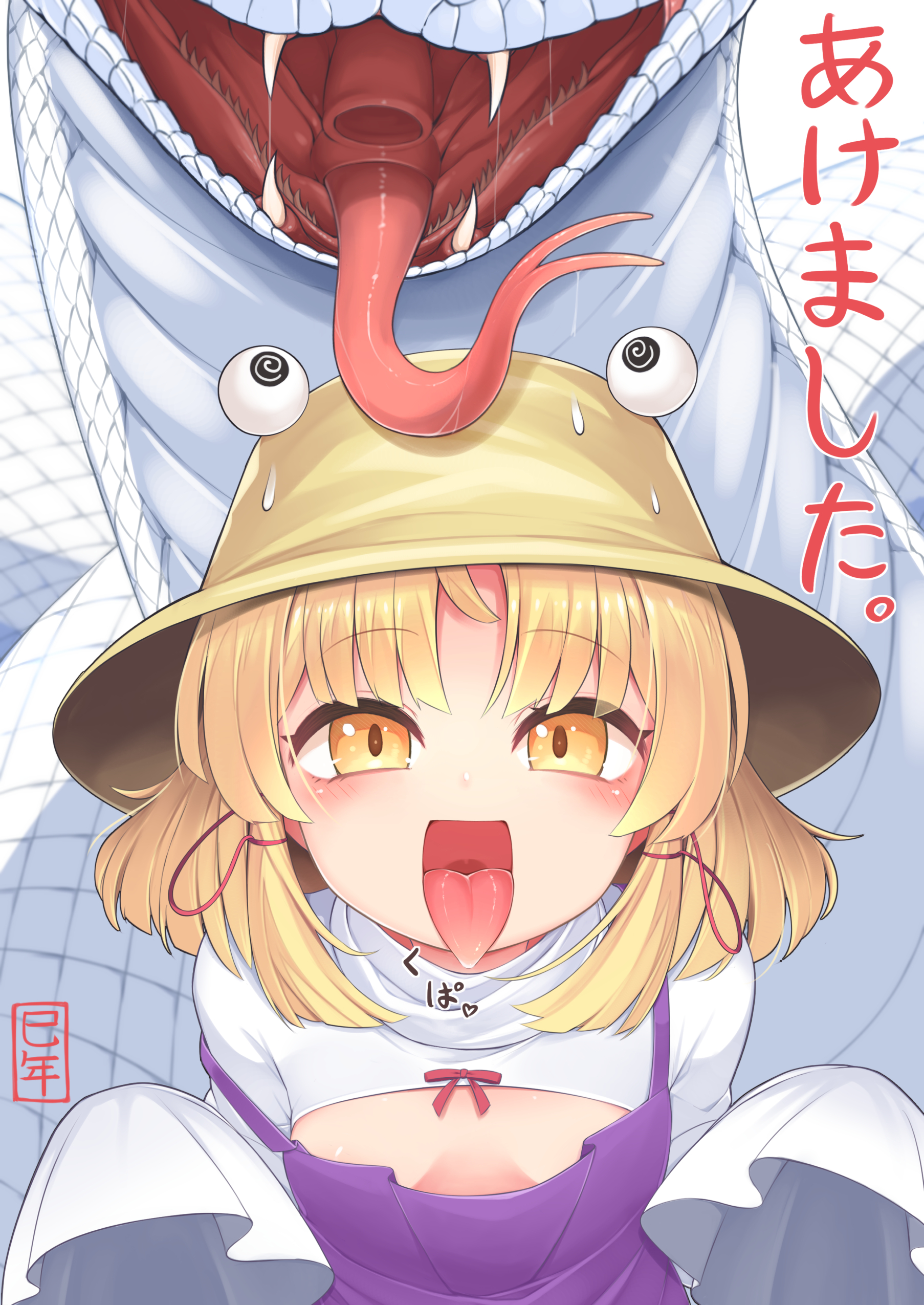 1girlanimalblonde hairbreastschinese zodiachatlong sleeveslooking at viewermedium hairopen mouthoral invitationoversized animalparted bangssleeves past fingerssleeves past wristssmall breastssnakesolotonguetongue outuvulayear of the snakeyellow eyes