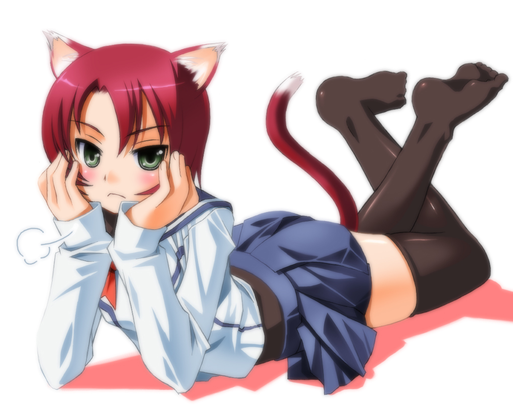 00s1boy1girlanimal earsbad anatomybad feetblushcrossed legsfeetfemale focusgreen eyeslyingon stomachpoorly drawnred hairschool uniformsittingskirtsolotailthighhighszettai ryouiki