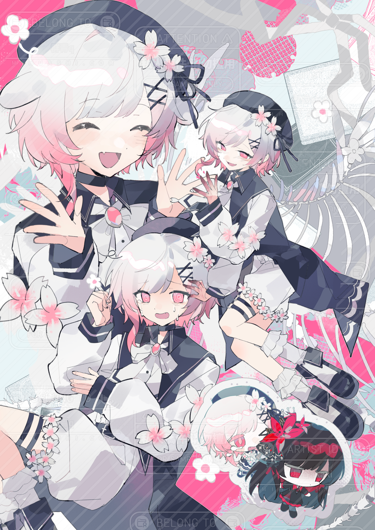 :d1boy2girlsanimal earsberetblack hairblack hatblack shoesclosed eyescolored extremitiesdog earsfangflowergradient hairhair flowerhair ornamenthands uphathat flowerkemonomimi modelong hairlong sleeveslooking at viewermagical girlmulticolored hairmultiple girlsmultiple viewsnervous sweatingopen mouthpink eyespink hairred eyesred flowershoesshort hairskeletal wingssmilesockssweatthigh strapwhite flowerwhite hairwhite sockswingsx hair ornament