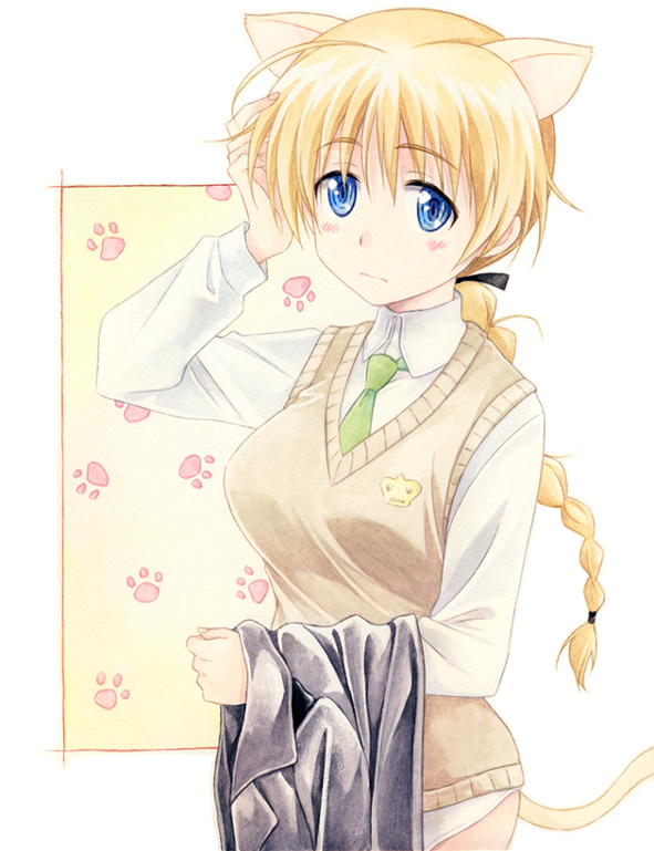 00s1girlanimal earsblue eyesbraidbreastscat earsfemale focusmedium breastssingle braidsolosweater vestvest