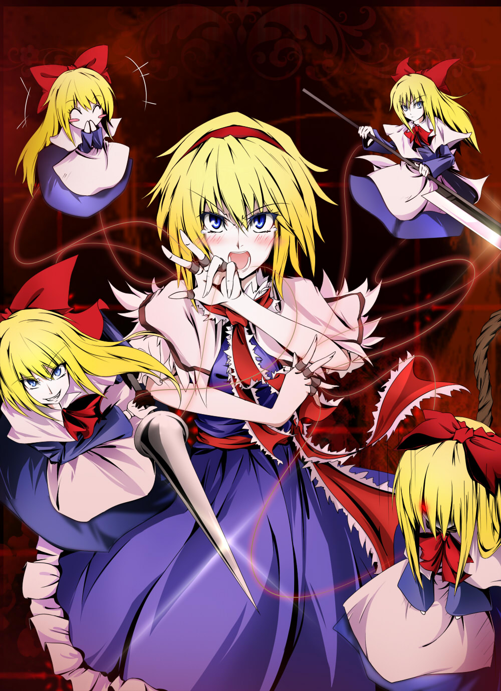 koshka pic, original, highres, 1girl, animal, bare legs, between legs, blonde hair, blue background, blue eyes, fangs, from side, hand between legs, hood, hood down, hoodie, long hair, long sleeves, looking at viewer, open mouth, signature, sitting, snow, solo, teeth, twitter username, white hoodie, wolf