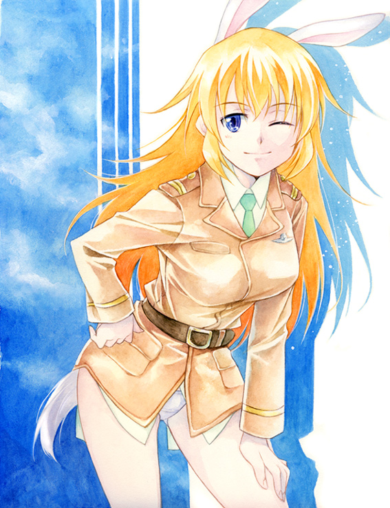 00s1girlanimal earsbeltblue eyesbreastsfemale focuslarge breastsmilitarymilitary uniformone eye closedpantiesrabbit earsrabbit girlsolounderwearwink