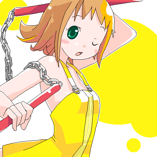 1990s (style)1girlbrown hairdressfemale focusflat chestflipped hairgreen eyesno branunchakuoekakione eye closedoverallsretro artstyleshort hairskirtsoloweaponwinkyellow overallsyellow skirtzipper dress