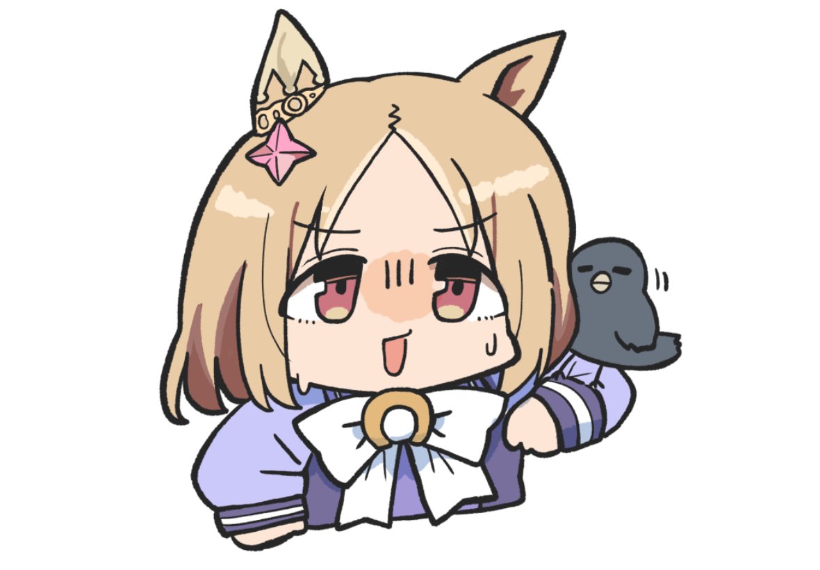 :d1girlanimalanimal earsanimal on armbirdbowbrown hairchibiclosed eyescropped torsocrowforeheadhorse earslong sleevesmotion linesmulticolored hairopen mouthparted bangspurple shirtred eyesschool uniformshirtsimple backgroundsleeves past wristssmilesolostreaked hairsweattracen school uniformupper bodywhite backgroundwhite bow