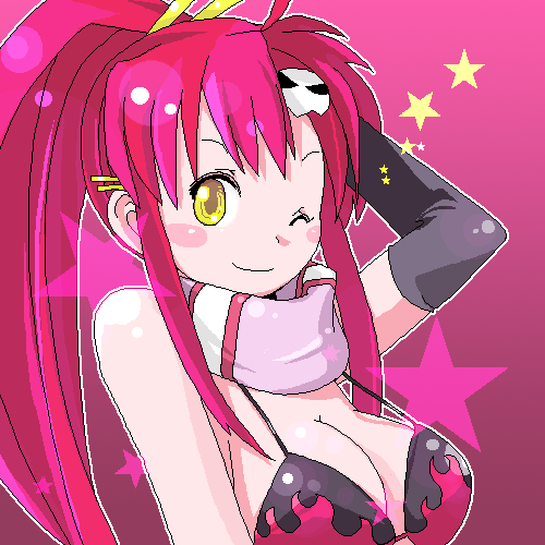 00sbikinibikini top onlybreastscleavageelbow glovesgloveshair ornamentlarge breastsoekakione eye closedponytailred hairscarfskullsmilesolostar (symbol)striped clothesstriped scarfswimsuitwinkyellow eyes