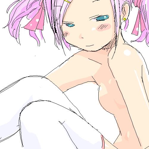 1girlaqua eyesblushbreastsearringsfemale focusflat chesthair ornamenthairclipjewelryno nipplesnudeoekakipink hairribbonsittingsolothighhighstopless femaletwintailswhite thighhighs