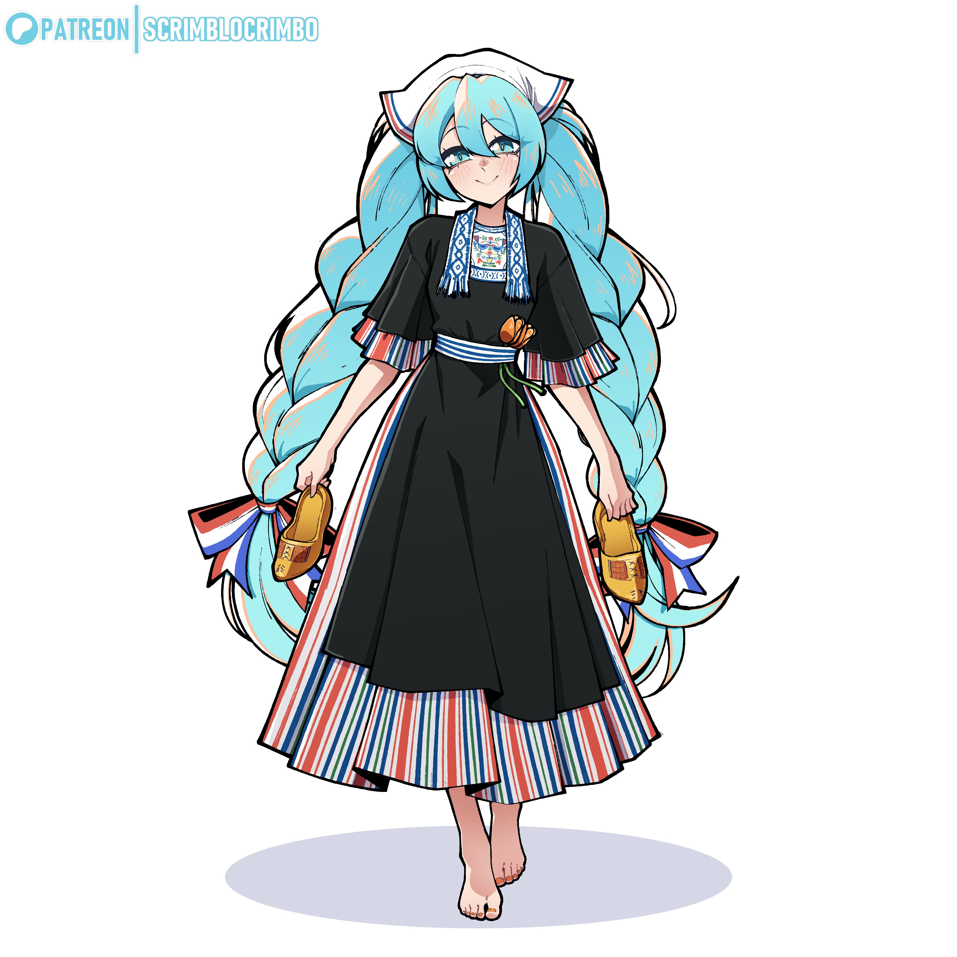 1girlalternate costumeaqua eyesaqua hairartist namebarefootblack dressblushbowbraidclosed mouthdressfeetflowerfull bodyhair between eyeshair bowholdingholding shoesholding unworn clotheslong dresslong hairlooking at viewermulticolored dressnail polishorange flowerorange nailsorange tulippatreon logoshadowshoesshort sleevessimple backgroundsmilesolotoenail polishtoenailstoestuliptwin braidsunworn shoesvery long hairwhite background