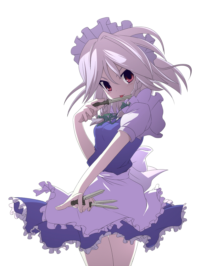 yamamoto nori, flandre scarlet, izayoi sakuya, remilia scarlet, embodiment of scarlet devil, touhou, 3girls, bat (animal), bat wings, between fingers, blue hair, braid, female focus, goth fashion, holding, knife, maid, multiple girls, red eyes, siblings, sisters, throwing knife, twin braids, weapon, white hair, wings