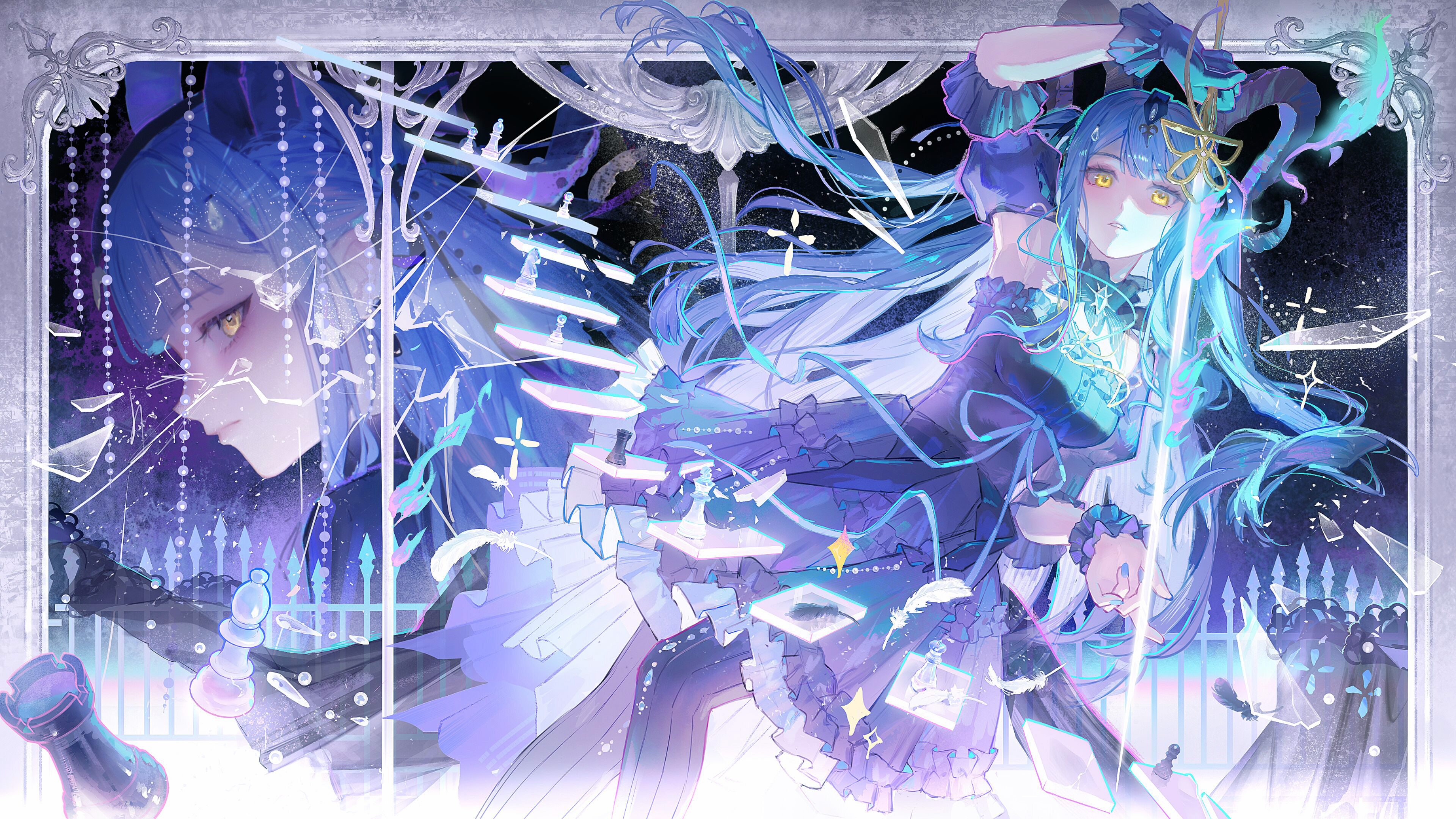 yahata umiri, arknights, bang dream!, bang dream! it's mygo!!!!!, absurdres, chinese commentary, commentary request, highres, procreate (medium), 1girl, animal ears, bare shoulders, black dress, black gloves, black hair, black shorts, black thighhighs, blue eyes, blue ribbon, bone print, breasts, chain, collar, crinoline, diagonal bangs, dress, elbow gloves, feet out of frame, gloves, hands up, holding, holding chain, kemonomimi mode, long hair, looking at viewer, medium breasts, ribbon, shorts, solo, spiked collar, spikes, standing, tail, thighhighs, wolf ears, wolf girl, wolf tail, yahata umiri (moonlight executioner), yong ye zhenma shi xiao shayu