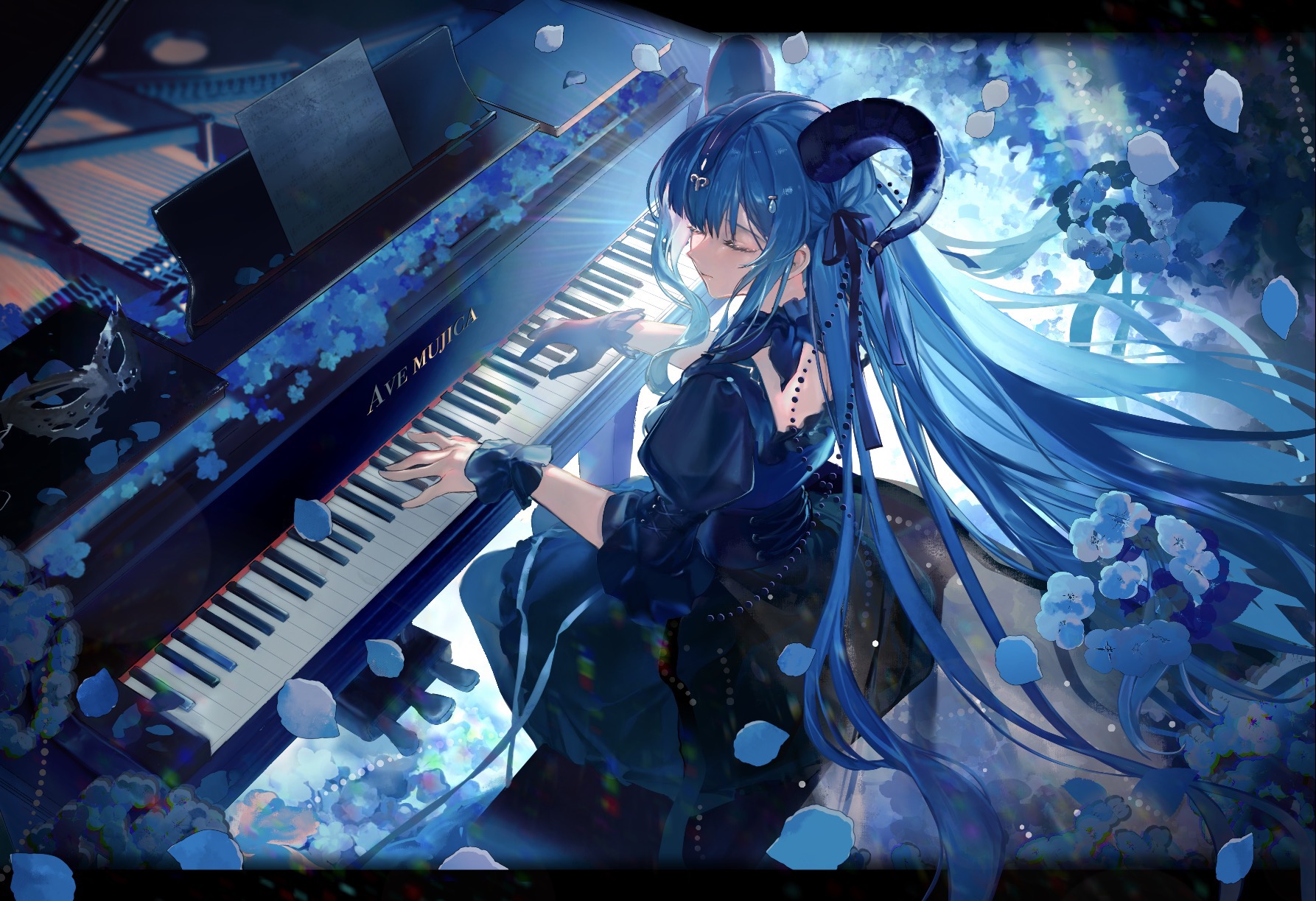 1girlblack dressblack glovesblack hornsblack ribbonblue flowerblue hairclosed eyesclosed mouthcurled hornsdressfloral backgroundflowerfrom abovegloveshair ribbonhornsinstrumentlong hairmusicpetalspianopiano benchplaying instrumentplaying pianopuffy sleevesribbonsidelockssingle glovesittingsolotwo side upwrist cuffs