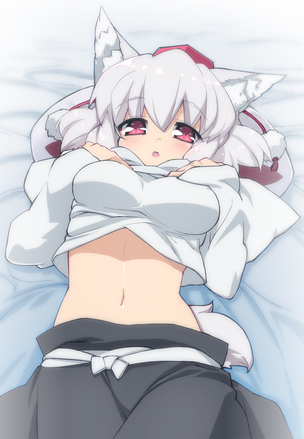 1girlanimal earsblushbreastsfemale focushatlarge breastslyingmidriffnavelpink eyessolotailwhite hairwolf earswolf tail