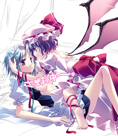 2girlsbarefootbat wingsblue hairbonnetbraidbreastscoupleeye contactfemale focusfrillshairbandhatlooking at anothermedium breastsmultiple girlsnaughty faceno braopen clothesopen shirtpink eyesred eyesribbonshirtshort hairtwin braidswingsyuri