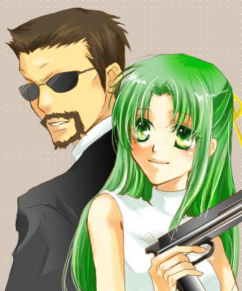 00s1boy1girlbeardblack suitblushbrown hairfacial hairformal clothesgreen eyesgreen hairgunhair ribbonhalf updolong hairribbonshort hairsmilesuitsunglassesweapon