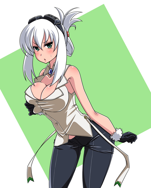 1girlaqua eyesbare shouldersblushbreastsbreasts squeezed togetherbuttonscleavagefemale focusfolded ponytailglovesgogglesgoggles on headlarge breastsleaning forwardmolemole under eyepantsribbonshirtskin tightsleevelesssleeveless shirtsolosweatdropwhite hair