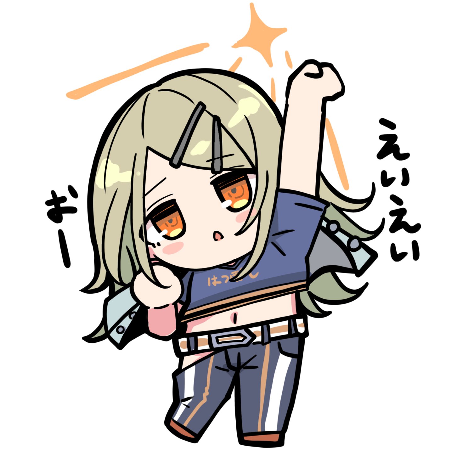 1boy1girlarm upblack pantsblue shirtblush stickersbrown hairchibicrop topfull bodygrey jackethair ornamenthairclipjacketjacket on shoulderslong hairlooking at viewermidriffnavelorange eyespantsparted lipsshirtshort sleevessimple backgroundsolostandingstanding on one legswept bangstriangle mouthvery long hairwhite background