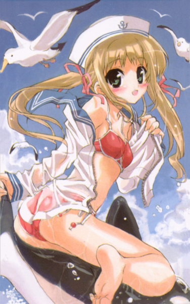 1girlartistic errorbarefootbikinibirdblonde hairdaydolphinfeetfemale focusgreen eyeshathead tiltlong hairoff shoulderred bikinisailorschool uniformseagullsee-through clothessee-through shirtserafukushirtsoloswimsuittwintailswetwhite hat