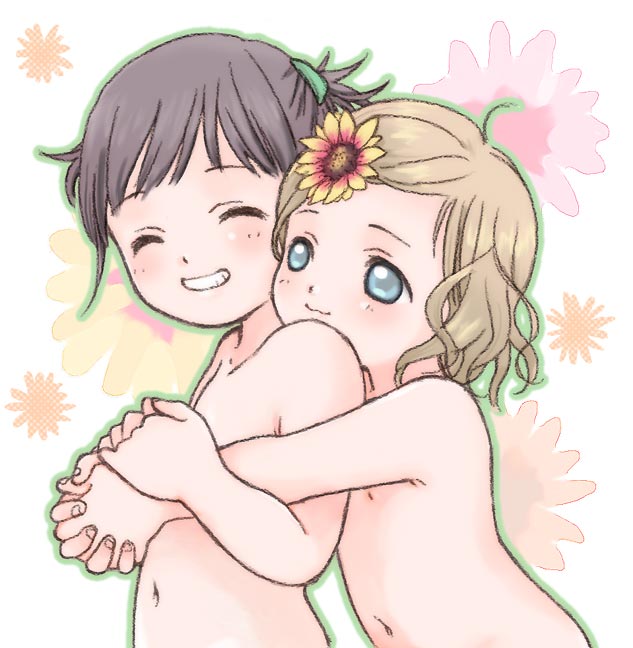 aoi kumiko, waha, yamato suzuran, suigetsu, plaid, striped, third-party edit, translation request, 2girls, bandaid, bandaid on pussy, bandaids on nipples, bandana, blush stickers, brown hair, chibi, fang, flat chest, flower, lily of the valley, loli, monochrome, multiple girls, narrow waist, nude, pasties, pointing, pumpkin, sepia, short hair, thigh gap, thighs, waha~ (meme)