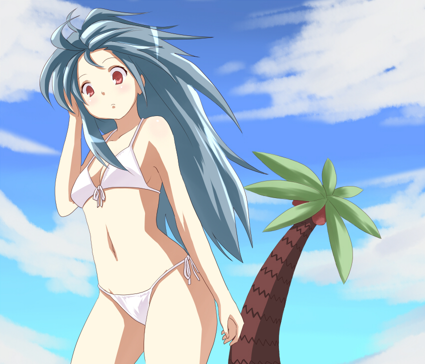 munyuu, highres, 1girl, bandaid, bandaids on nipples, barefoot, blue hair, blush, breasts, brown eyes, censored, convenient censoring, feet, feet together, female focus, hair ribbon, large breasts, lying, navel, nipples, nude, panties, panty pull, pasties, pillow, pink panties, polka dot, ribbon, solo, spread legs, toes, twintails, underwear