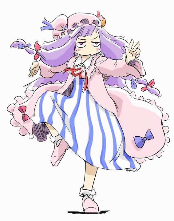 1girlblushboredbowcrescentcrescent hat ornamentdressfemale focusfighting stancehair bowhathat ornamentlong hairmultiple hair bowspurple hairribbonrobesketchsolostandingstanding on one leg