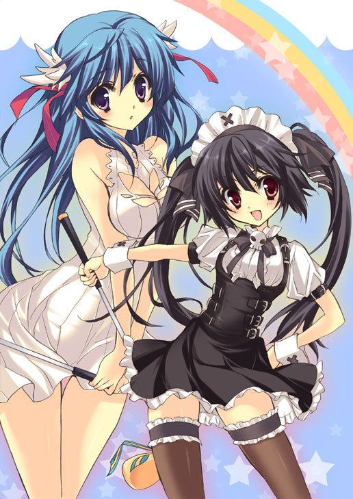 katou kei, satou sei, maria-sama ga miteru, 00s, 2girls, adjusting hair, asymmetrical legwear, biting, blonde hair, blush, breasts, brown eyes, brown hair, denim, from side, glasses, holding, holding shirt, holding unworn clothes, jeans, letterboxed, long hair, mouth hold, multiple girls, opaque glasses, pants, shirt, sideboob, sweat, t-shirt, thigh gap, topless female, unbuttoned, uneven legwear, unworn shirt, zoom layer