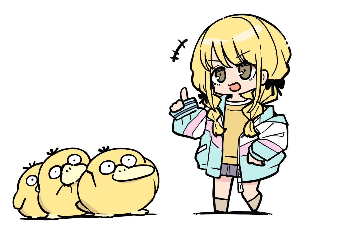 :d1boy1girlblack bowblonde hairbowbraidbrown eyesbrown shirtbrown sockschibicrossovergen 1 pokemongrey skirthair bowhair over shoulderhand upindex finger raisedlong hairlong sleeveslow twintailsopen mouthpinching sleevespleated skirtpokemon (creature)puffy long sleevespuffy sleevesshirtsimple backgroundskirtsleeves past wristssmilesocksstandingstanding on one legtwin braidstwintailsv-shaped eyebrowswhite background