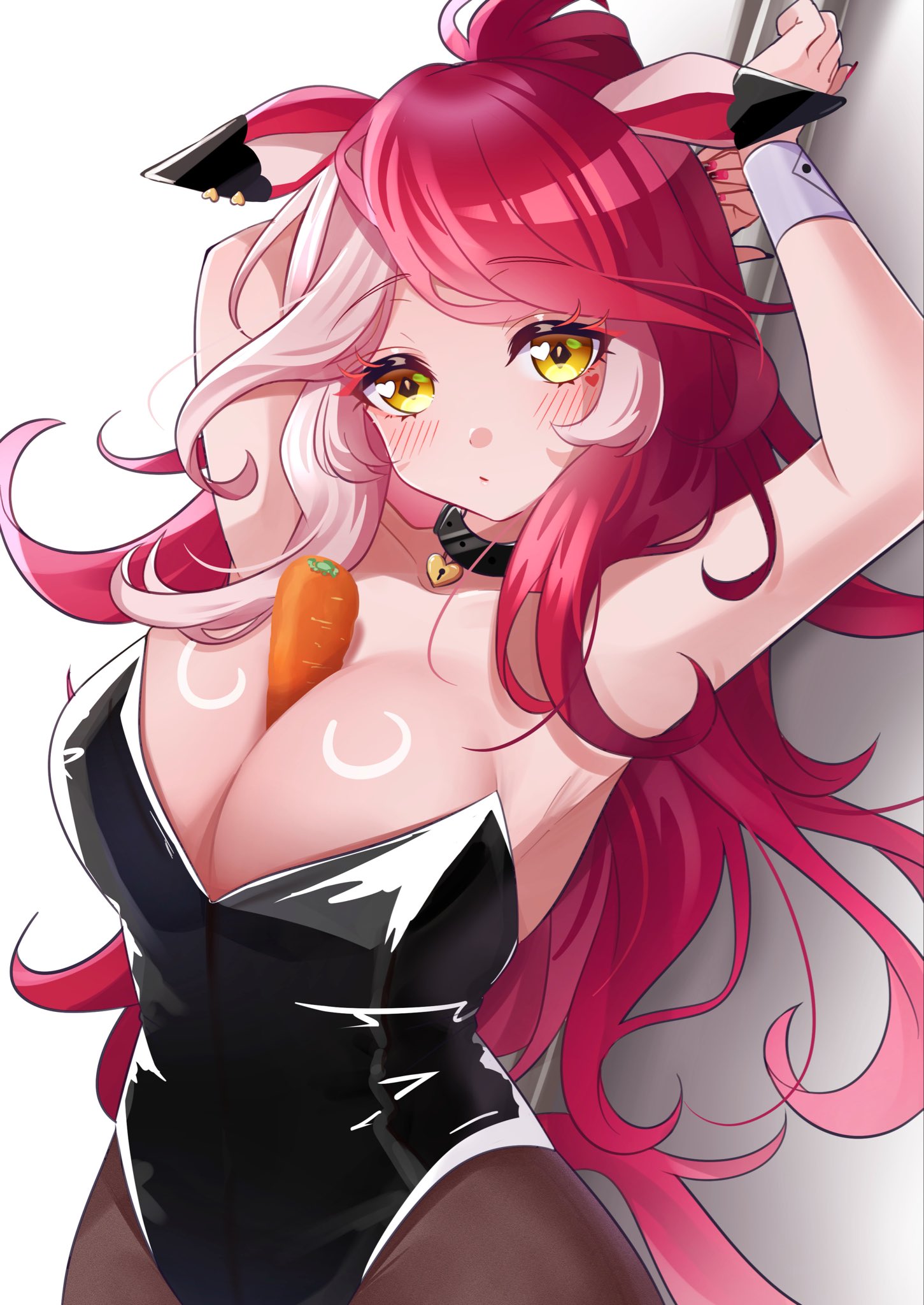 1girlbetween breastsblack leotardblushbreastscarrotchokercleavageearringsfood between breastsheartheart earringsjewelrylarge breastsleotardlong hairlooking at viewermulticolored hairnail polishpantyhoseplayboy bunnyred hairred nailssolotwo-tone hairwhite hairwrist cuffsyellow eyes