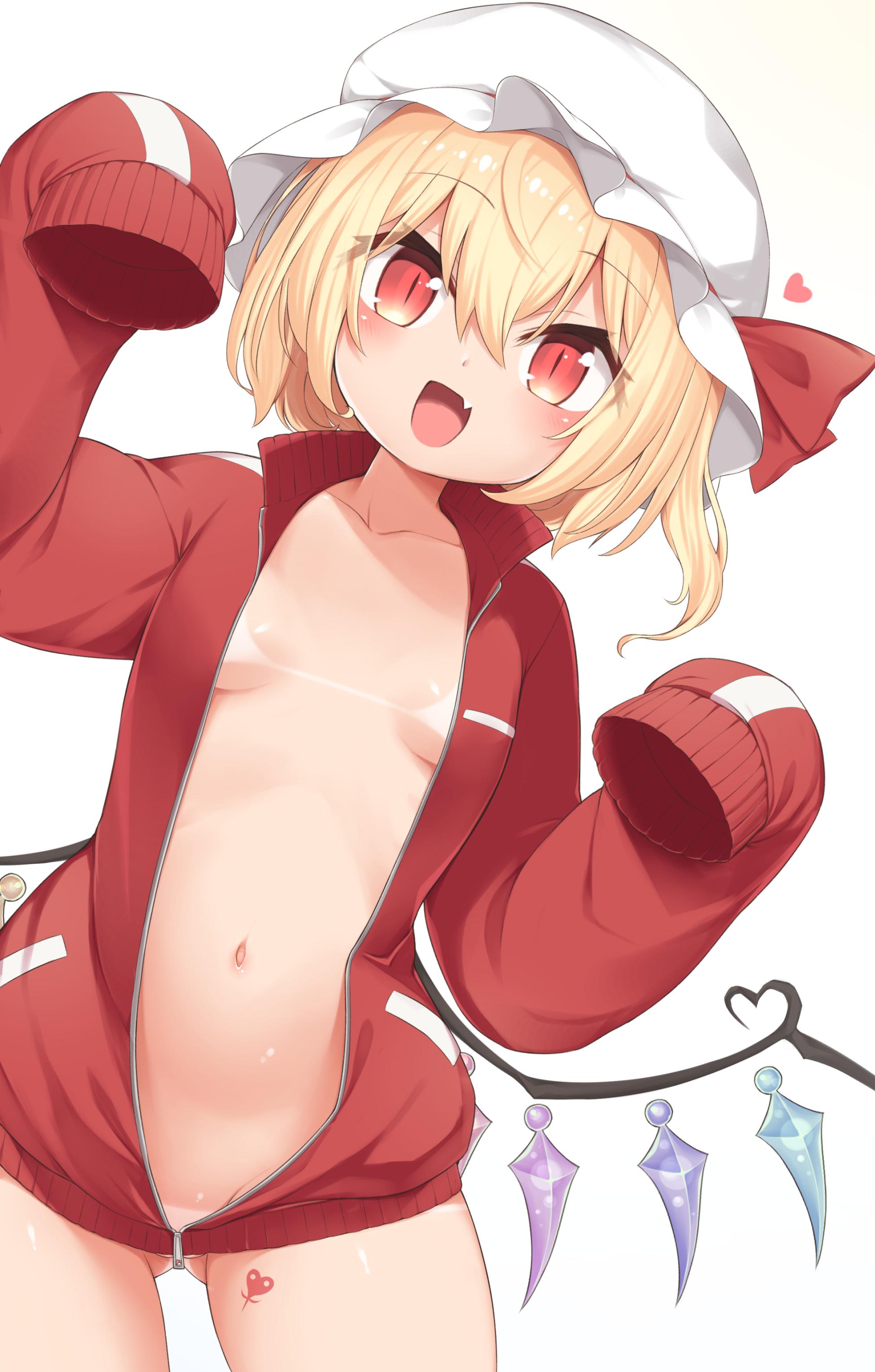 :d1girlblonde hairblushbottomlessbreastsfanggluteal foldhatjacketlong sleevesmedium hairmob capnaked jacketnavelno braopen clothesopen jacketopen mouthside ponytailsimple backgroundsleeves past fingerssleeves past wristssmall breastssmilesolostomachtrack jacketwhite backgroundwhite hat