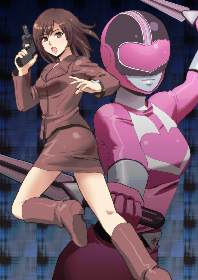 1girlanimificationarmorblazerbootsbreastsbrown eyesbrown hairgunhearthelmetjacketminiskirtpencil skirtpower armorshort hairskirtweapon