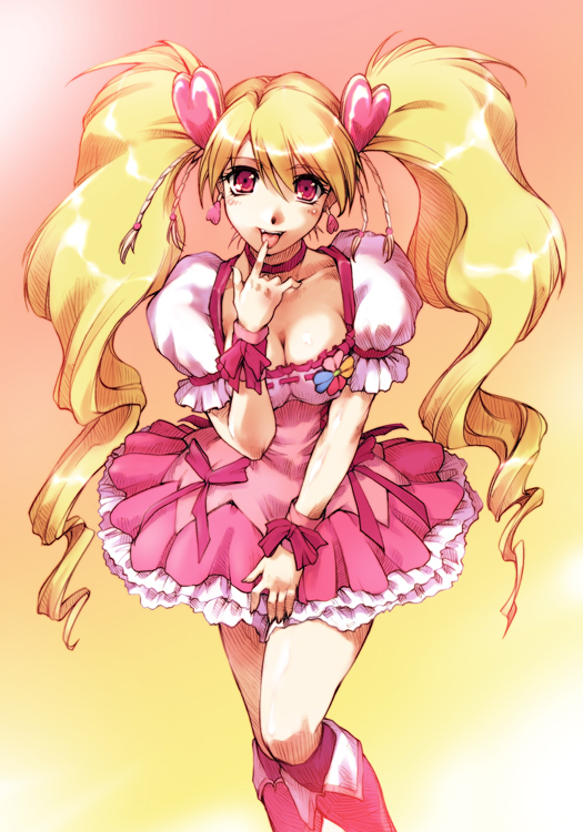 :p00s1girlblonde hairbootsbowbreastscleavagedressfemale focushair ornamentheartheart hair ornamentknee bootslong hairmagical girlpink bootspink bowred eyesskirtsolostandingtonguetongue outtwintails