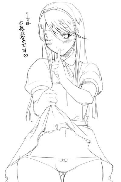 1boyalice (alice in wonderland) (cosplay)blushbowbow pantiesclothes liftcosplaydressdress liftfinger to mouthgreyscalelong hairlowleglowleg pantiesmale focusmonochromeone eye closedpantiesshushingsolothigh gapthighstrapunderwearwink