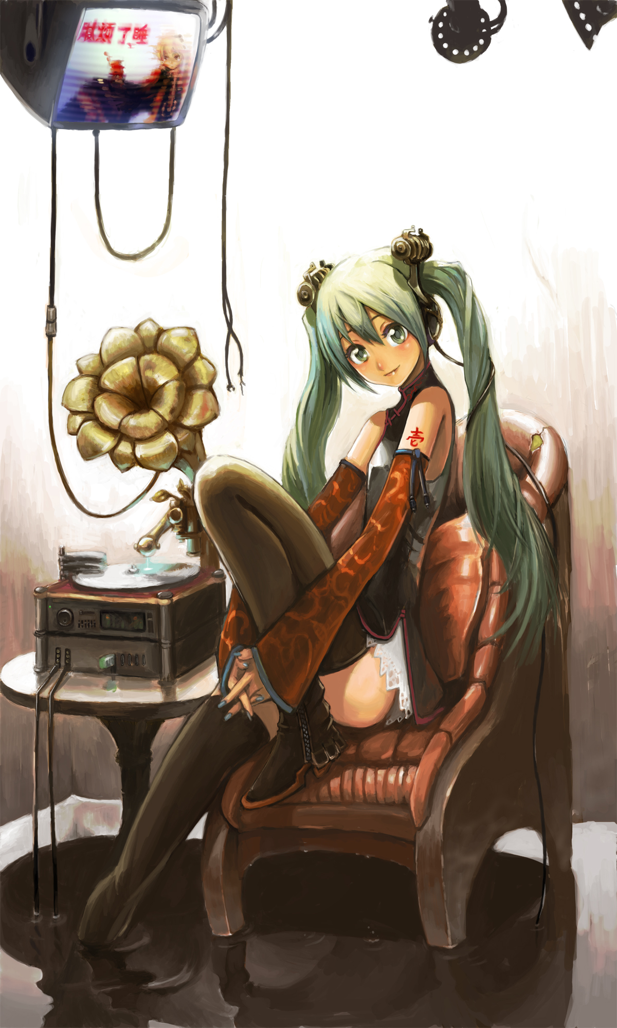 1girlblue nailsbootscablechina dresschinese clothesdetached sleevesdressfemale focusgreen eyesgreen hairheadphoneslacelegslong hairmatching hair/eyesnail polishphonographsittingsmilesolotattootelevisionthigh bootsthighhighstwintailswaterzipper