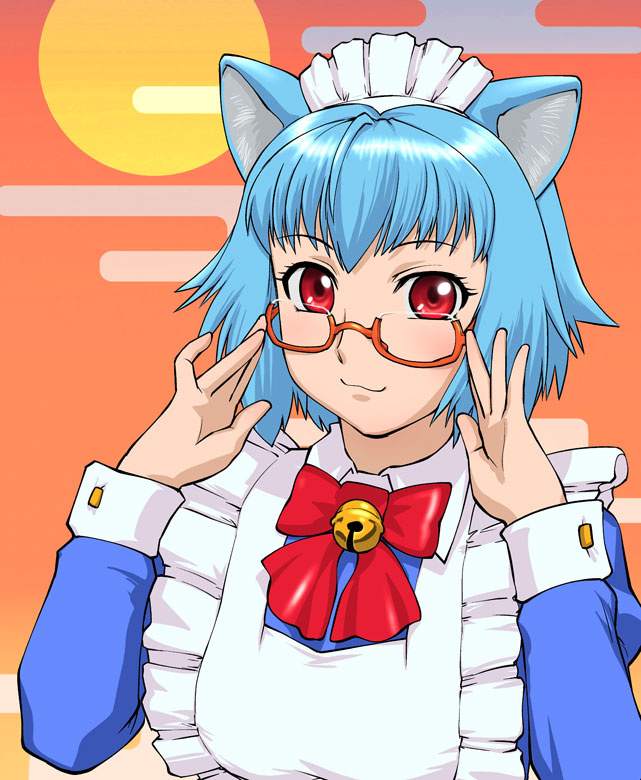 :31girladjusting eyewearanimal earsapronaqua hairbellblue haircat earscat girlfemale focusglassesheadbandmaidmaid apronred eyesribbonshort hairsmilesolo