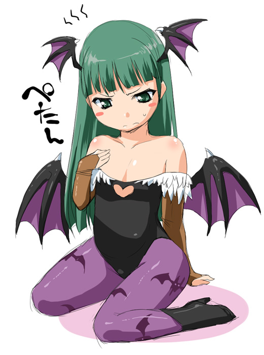 1girlaged downanimal printbat printblushfemale focusflat chestgreen eyesgreen hairhead wingslong hairmatching hair/eyespantyhoseprint pantyhosesolowings