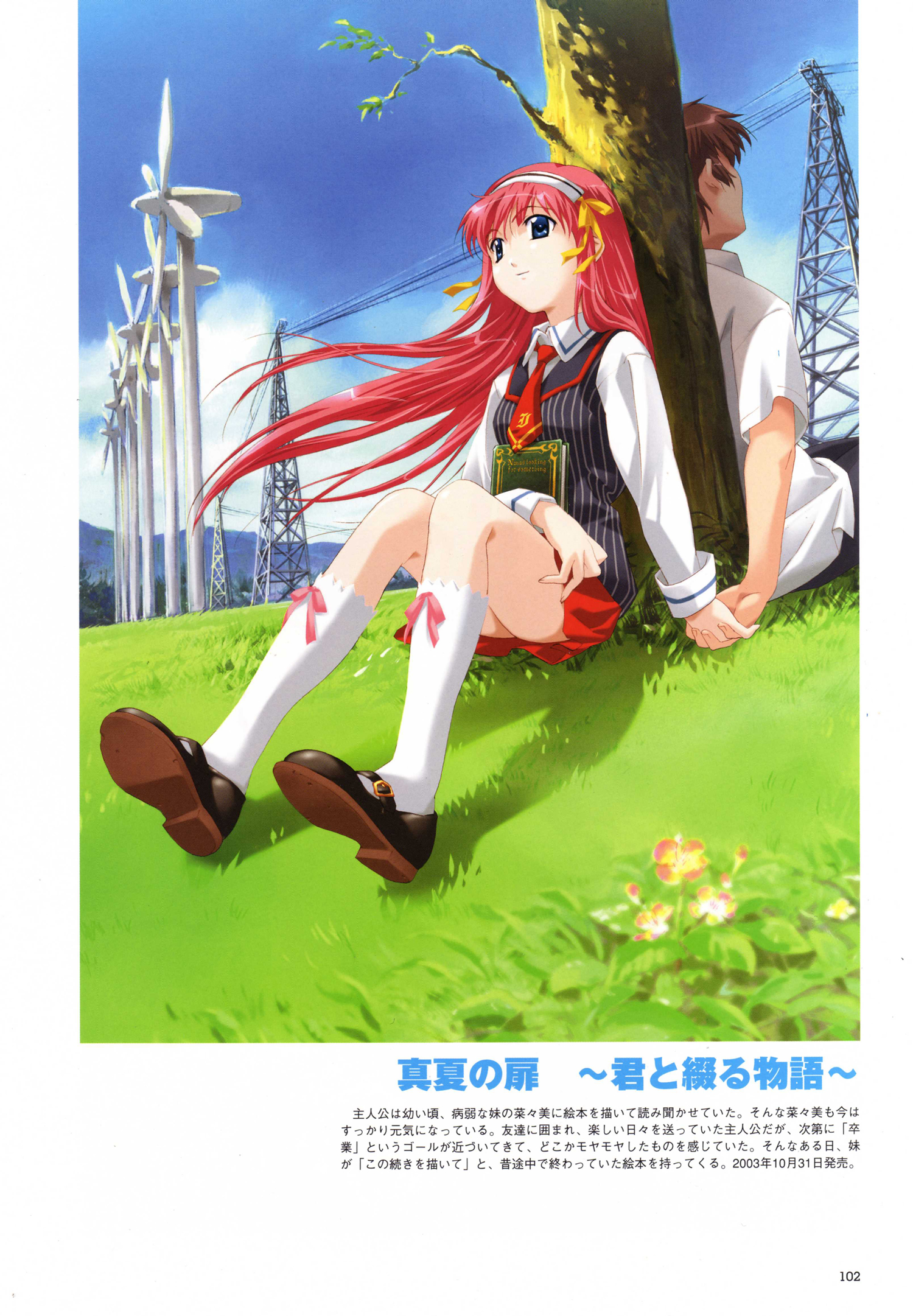 1boy1girlagainst treeback-to-backblue eyesbookbrother and sisterbrown hairdayflat chestflowergrasshair ribbonhairbandheteroholding handskneehighslong hairmary janesnecktieoutdoorspink hairpower linesribbonschool uniformshadowshoesshort hairsiblingssittingskirtsmilesockstreevestwhite sockswindwindmill