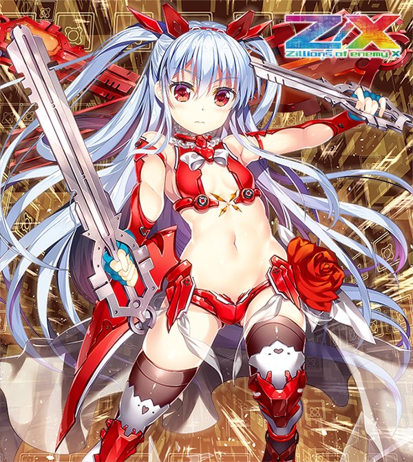 1girlaqua glovesblue hairbodysuitbreastscleavage cutoutclosed mouthclothing cutoutcopyright logofingerless glovesgloveshair ornamentholdingholding weaponlogolong hairnavelred bodysuitred eyesrevealing clothessmall breastssolotwo side upweapon