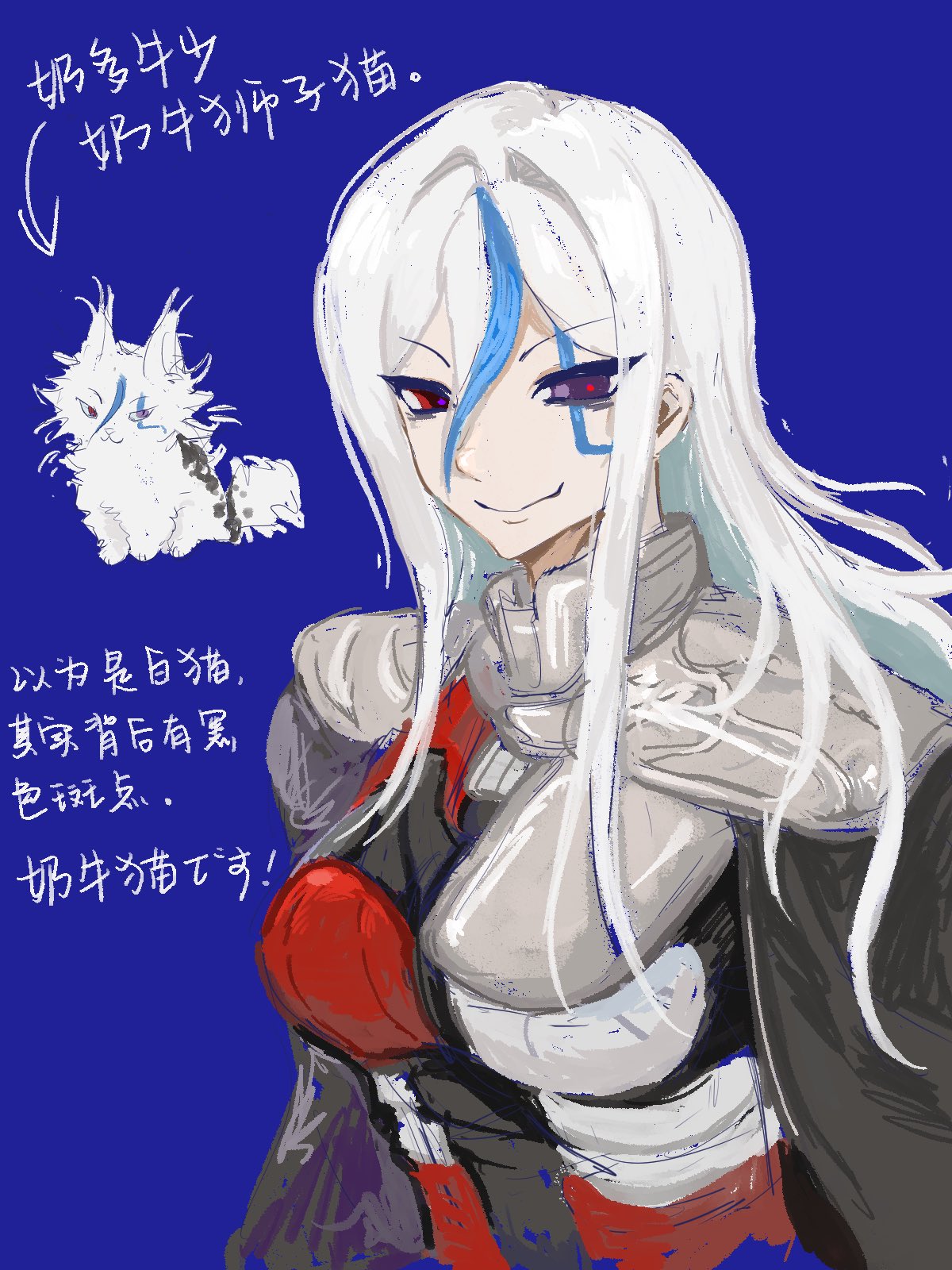 1girlarmorblue backgroundblue streaksbodysuitbreastscapecatfacial markgorgetgrinhaikarix48269heterochromialong hairmulticolored hairmultiple viewspurple eyesred eyesshoulder armorsmilestreaked hairwhite hair