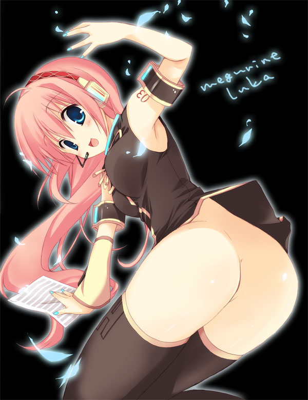 1girlassblue eyesbottomlessfemale focusheadsetlong hairlooking at viewerlooking backno pantiesopen mouthpink hairshirtsleevelesssolothighhighs