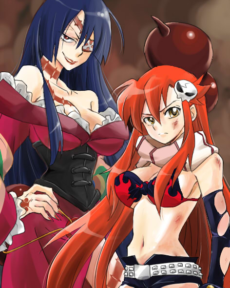 00s2girlsalternate hairstylebeltbikinibikini top onlyblue hairbreastscleavagecorsetdresseyepatchgloveshair ornamentlarge breastslipsticklong hairmakeupmidriffmultiple girlsred hairscarfscorpion tailshortsswimsuittailtattootorn clothestorn glovesvery long hairyellow eyes