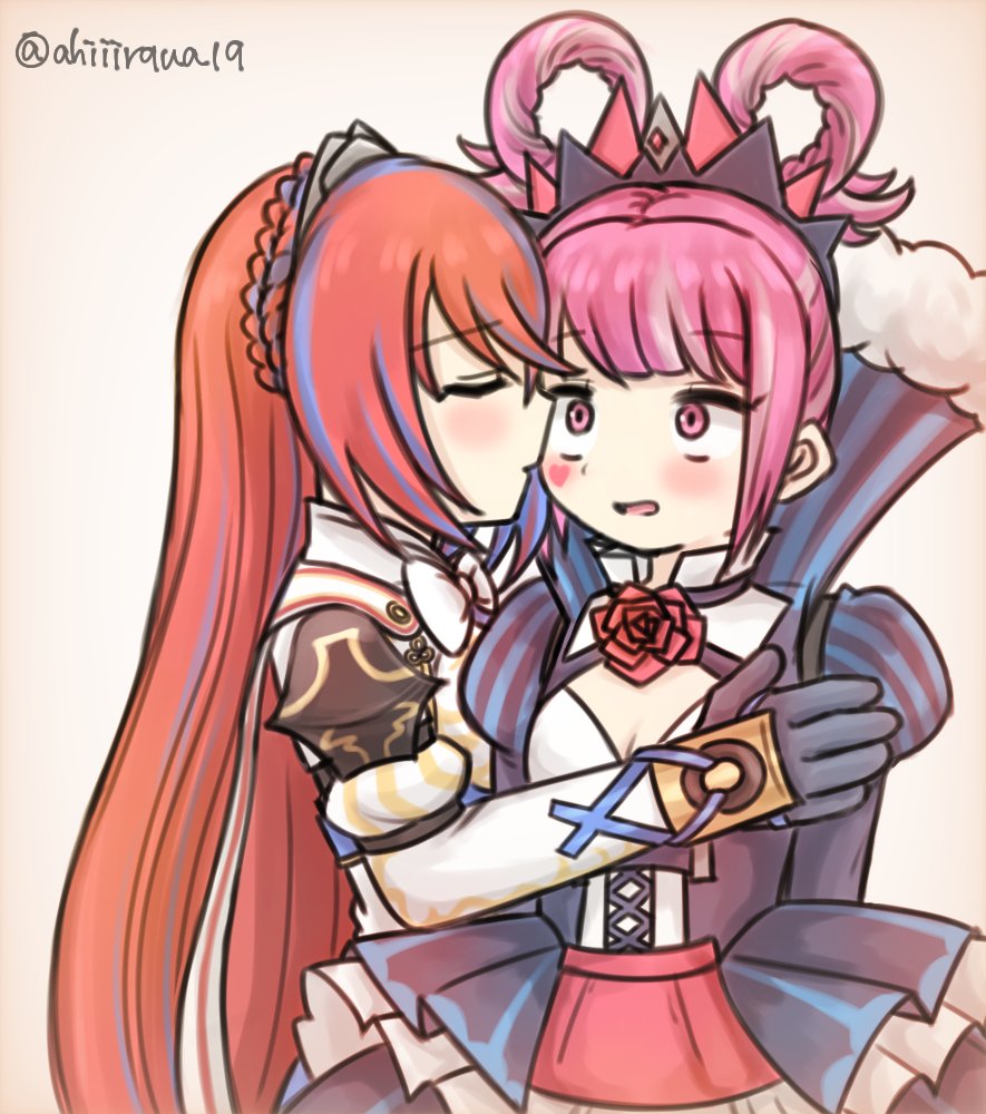 2girlsblue dressblue hairblushbreastscapecleavageclosed eyesdressfacial markhair ringsheartheart facial markhuglong hairlooking at anothermulticolored hairmultiple girlsopen mouthred hairshort hairsmall breaststwitter usernametwo-tone hairvery long hairwhite backgroundyuri