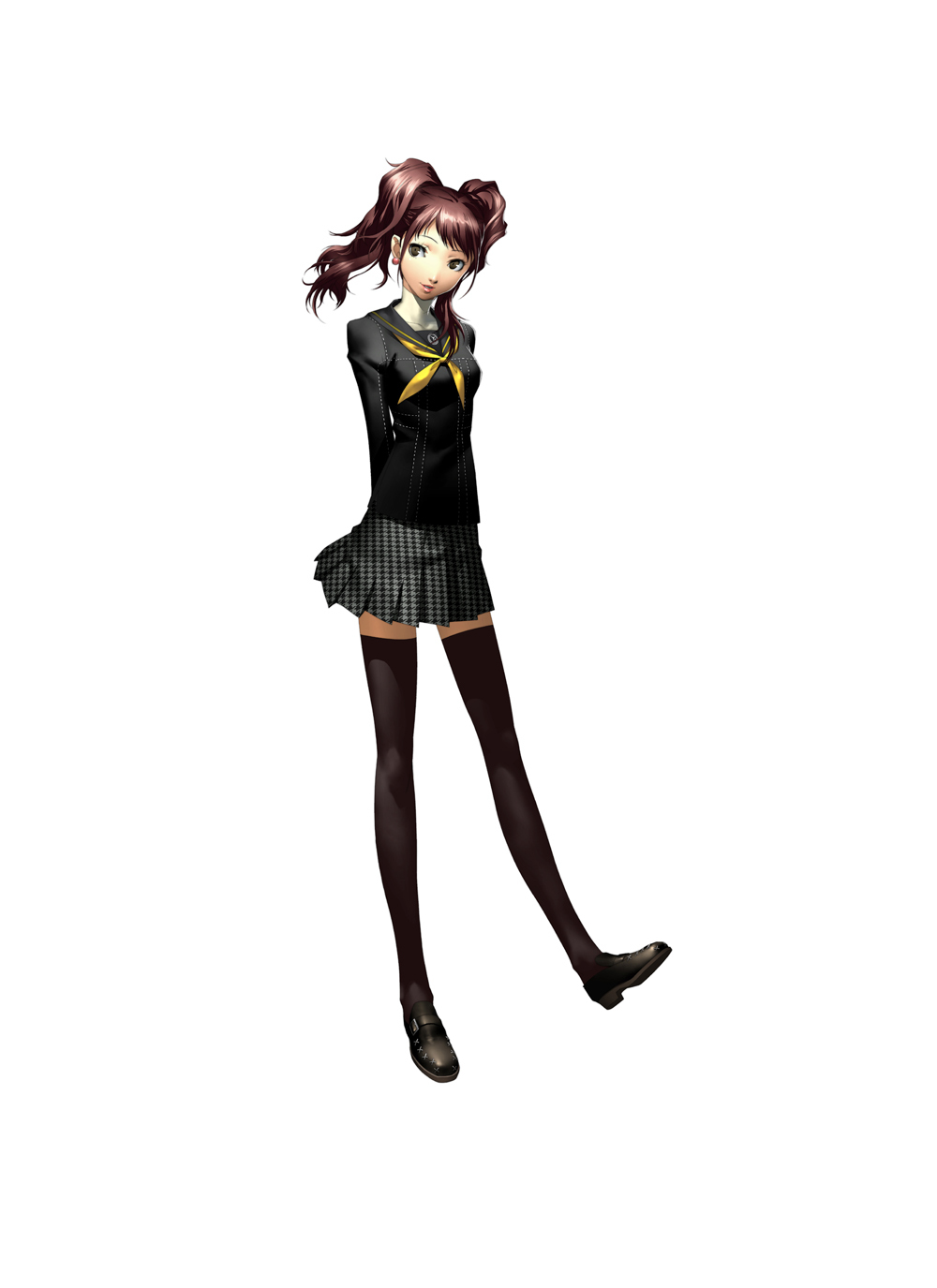 arms behind backbrown eyesearringsjewelryred hairschool uniformskirtsmilesolothighhighstwintails