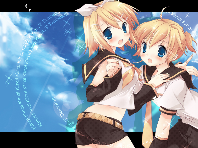 1boy1girlassblonde hairblue eyesbrother and sisterclouddayhair ribbonopen mouthribbonromaji textshort hairsiblingsskytwins