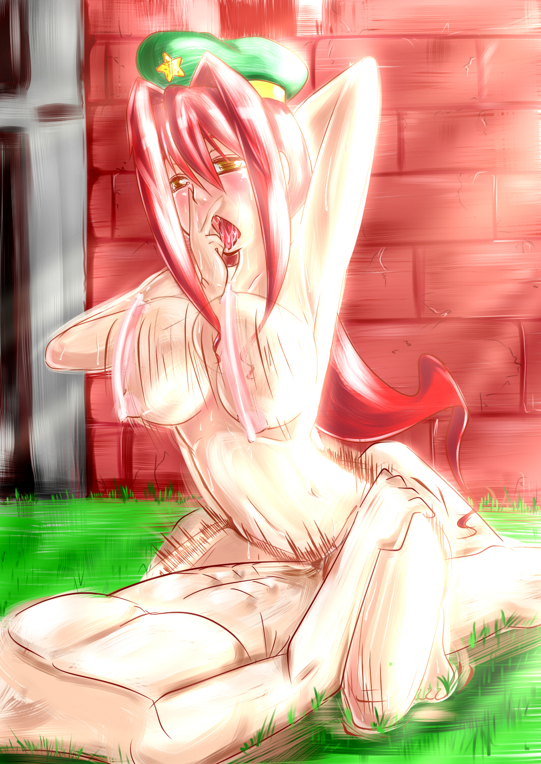 arm behind headassertiveblushbouncing breastsbreastsbrick wallcowgirl positionfemaleFlag for Deletionfull-face blushgrasshalf-closed eyeshand on own facehatlarge breastsmotion blurmotion linesnavelnudeopen mouthoutdoorspayotred hairsalivasexstraddlingsweattonguetongue outtorogao