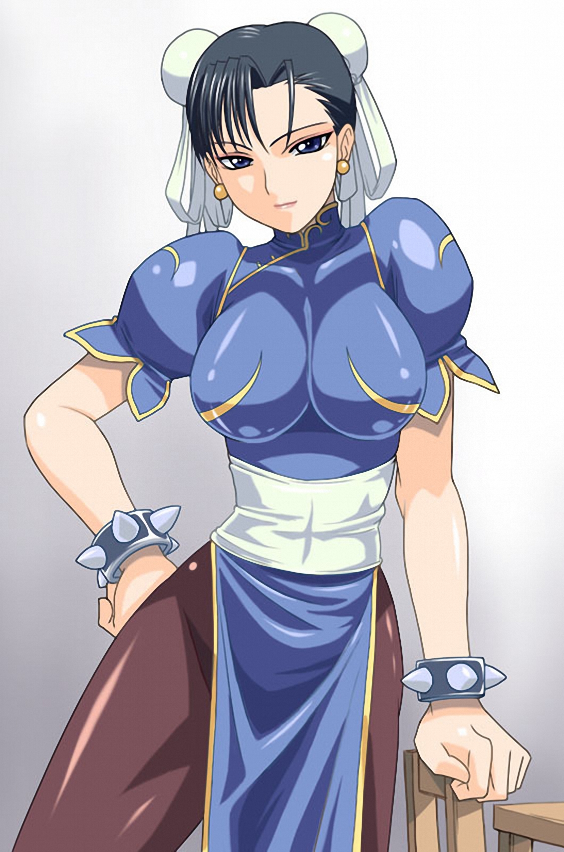 1girlblack hairbraceletbreastsbun coverchina dresschinese clothesdouble bundressearringsfemale focushair bunhand on own hipjewelrylarge breastspantyhosepelvic curtainpurple eyesshiny clothesshort hairsolospiked braceletspikes